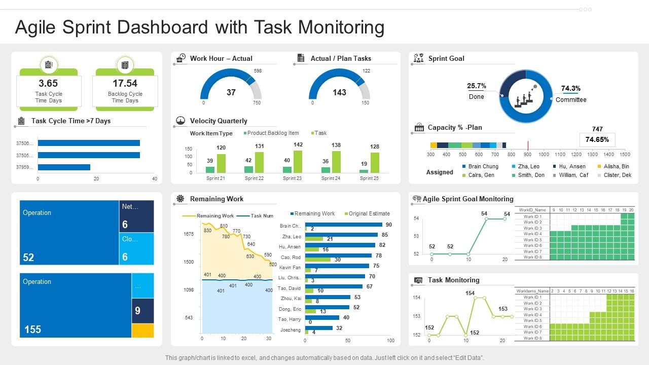 스프린트 번다운 차트. 우리 기술 보고서에 기술된 바와 같이 이 그래픽 기술은 하나의 스프린트 동안에 개발팀의 진척을 나타내는 수단을 제공한다. 작업 백로그에 있는 하나의 아이템이 완료되면 차트가 진행 상황의 비율과 양을 표시한다. 일반적으로 이와 같은 차트는 팀에 있는 일반적인 벽이나 전자적인 대시보드에 표시된다.